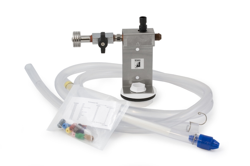 Stoppa ned mixerns sugslang med bottenventil i stora fatsprundet och skruva fast mixern med den stora gängan. Ta bort den lilla fatpluggen så att luft obehindrat kan komma in och förhindra att vakuum uppstår. Anslut mixerns slang för inkommande vatten till vattennätet. (Obs. lokala föreskrifter) Sätt in munstycke enl. tabell och mät sedan för att kontrollera att det blir rätt blandning.