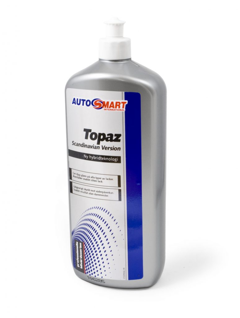 Topaz Scandinavian Version är en smart produkt som erbjuder ett flertal fördelar i en och samma lösning. Den är 100% dammfri och kritar inte. Det innebär att den lämnar exempelvis inga rester runt emblem, dekaler, lister, backsensorer etc. Topaz mycket enkel och snabb att applicera och lämnar en enorm glans, då den innehåller tillsatser för att intensifiera blekta lacker och behandla små repor.