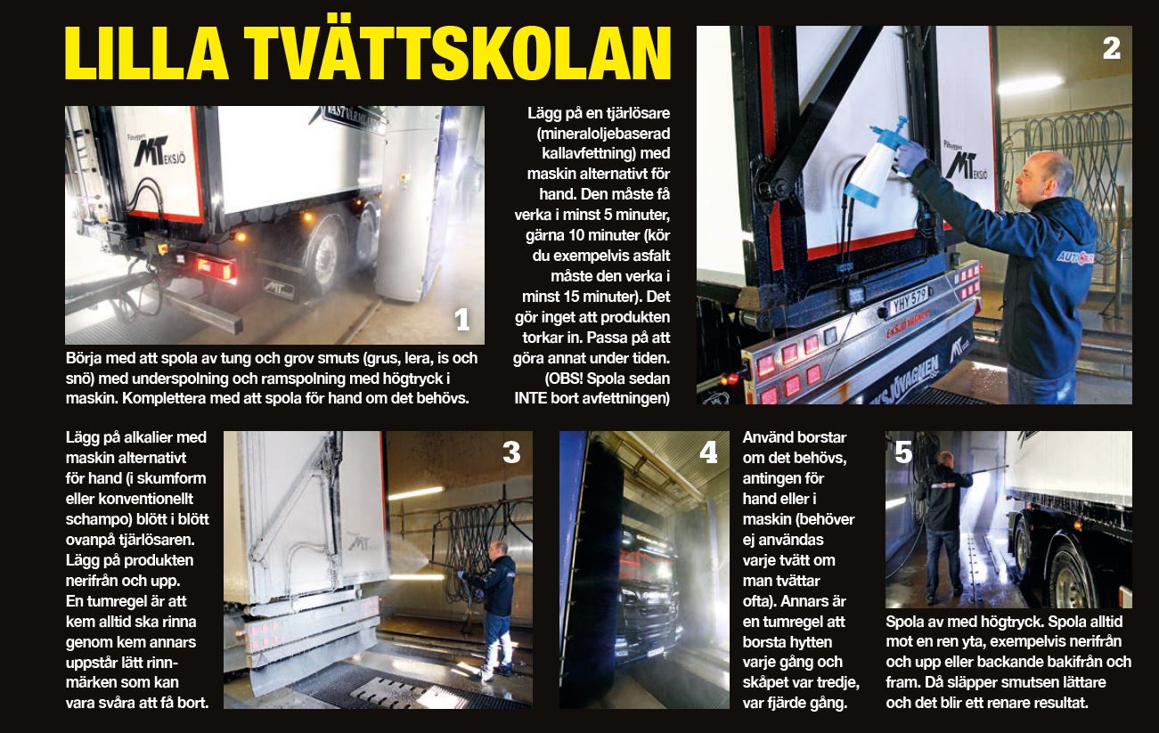 Att tvätta bilen är väl en lätt match! Lite avfettning, högtryck, schampo och borstar. Sedan är det klart. Nja! Riktigt så enkelt är det inte. Särskilt när det kommer till en lastbil. Trailer har träffat några riktiga experter på området från Smartab och Westmatic. Under en intressant dag i Arvika höll de tvättskola med oss. För det gäller att ha koll på vad man gör och då handlar det en hel del om kemi.